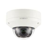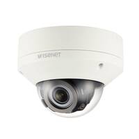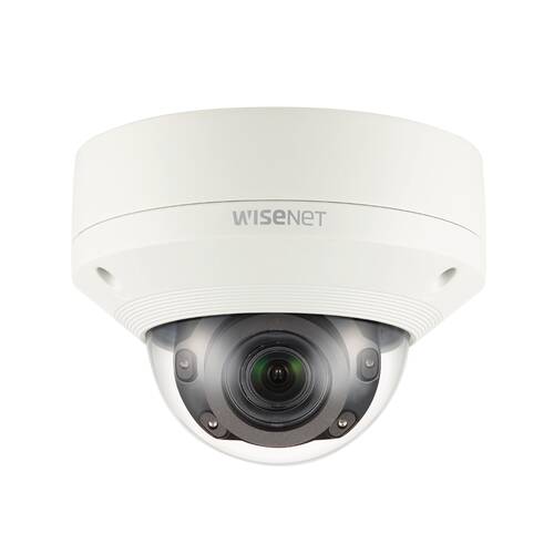 Wisenet X aangedreven door Wisenet 5 netwerk IR vandaal-domecamera voor buiten, 5MP @30fps WDR uit/aan, gemotoriseerde varifocale lens 2,4x (3,9~9,4 mm) (92,1°~38,7°), H.265/H.264/ MJPEG, WiseStream II-compressietechnologie, 120dB WDR, USB-poort voor eenvoudige installatie, Geavanceerde videoanalyse en geluidsclassificatie, Krachtige IR-leds met een bereik van 164', True D/N, Dual SD-kaart, Gangzicht, HLC, Ontwasemingsdetectie met eenvoudige focus, DIS , 12VDC/24VAC/PoE, IP67, IK10, NEMA 4X, Ingebouwde -40°F verwarming