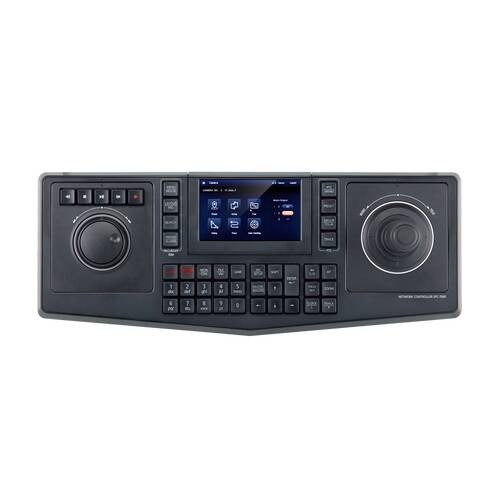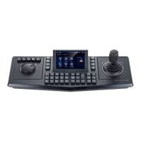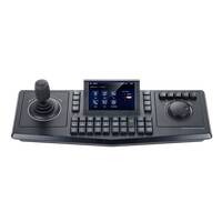 Hanwha, netwerktoetsenbordcontroller, IP-toetsenbord met 5 inch TFT-kleurenmonitor, voor het aansturen van IP-camera's en SSM-software, 3-assige joystick voor het aansturen van PTZ's, los te koppelen van het toetsenbord voor afzonderlijk gebruik, jog/shuttle voor universele bediening, ondersteuning USB-interface en netwerkconnectiviteit, cameratitels snel in kaart brengen, 12V DC.