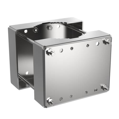 Paalmontage in elektrolytisch gepolijst 316L roestvrij staal voor gebruik in combinatie met AXIS TQ1001-E WALL MOUNT, ontworpen voor zware industriële omgevingen. Paaldiameters 50-150mm (2" - 6"). Maximale belasting 150kg / 331 lb.